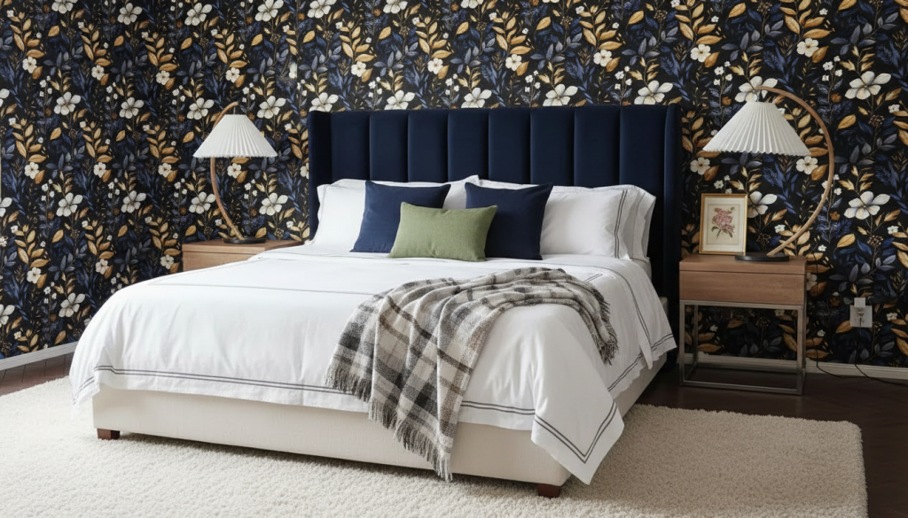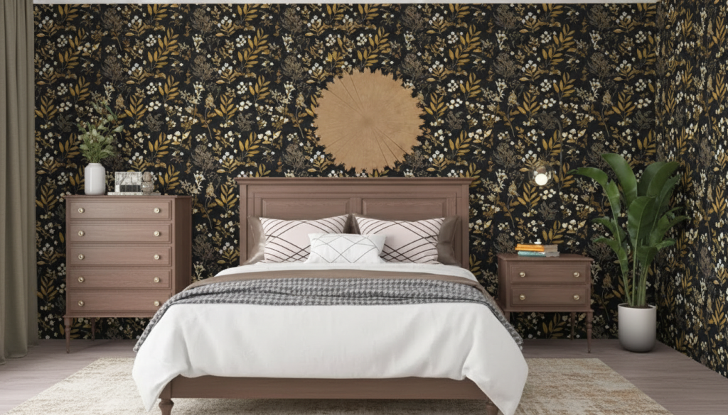 This is for people who want the bedroom to feel like a boutique hotel. Dark floral with gold accents can look surprisingly sophisticated, especially with warm bedside lighting.