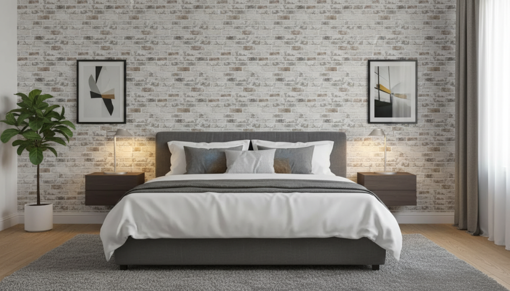 Brick can instantly create a cozy loft vibe—especially in small bedrooms that need more visual interest. The gray/white palette keeps it light, which is key for bedrooms (dark brick can feel heavy fast).